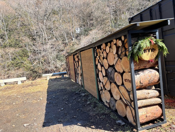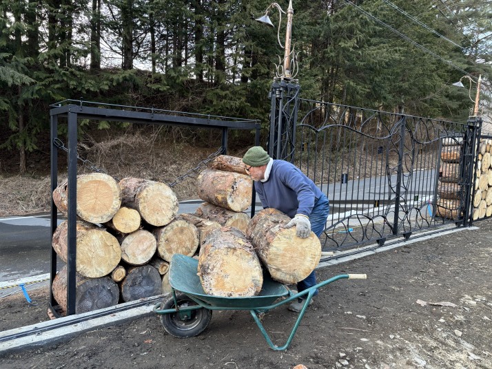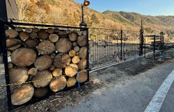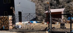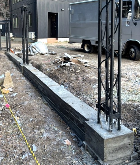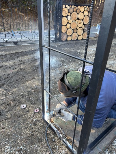 また、門扉のサイドに設置した鉄枠の丸太入れは、このあと製作工事を進める予定の、施設の塀にもなります。